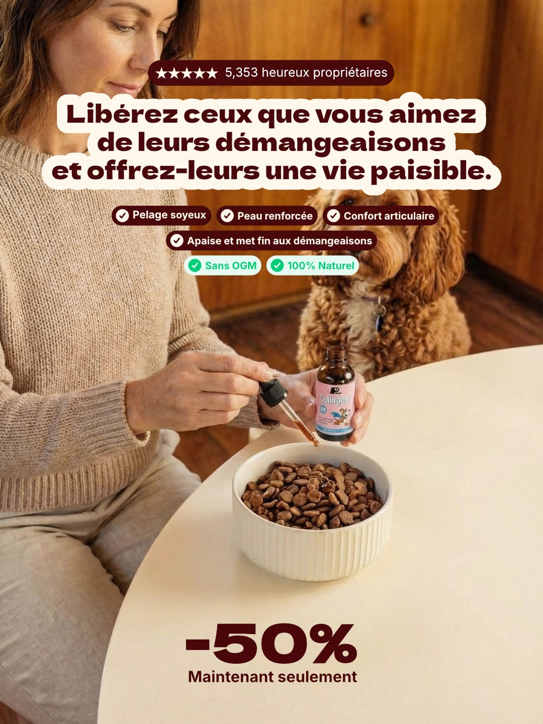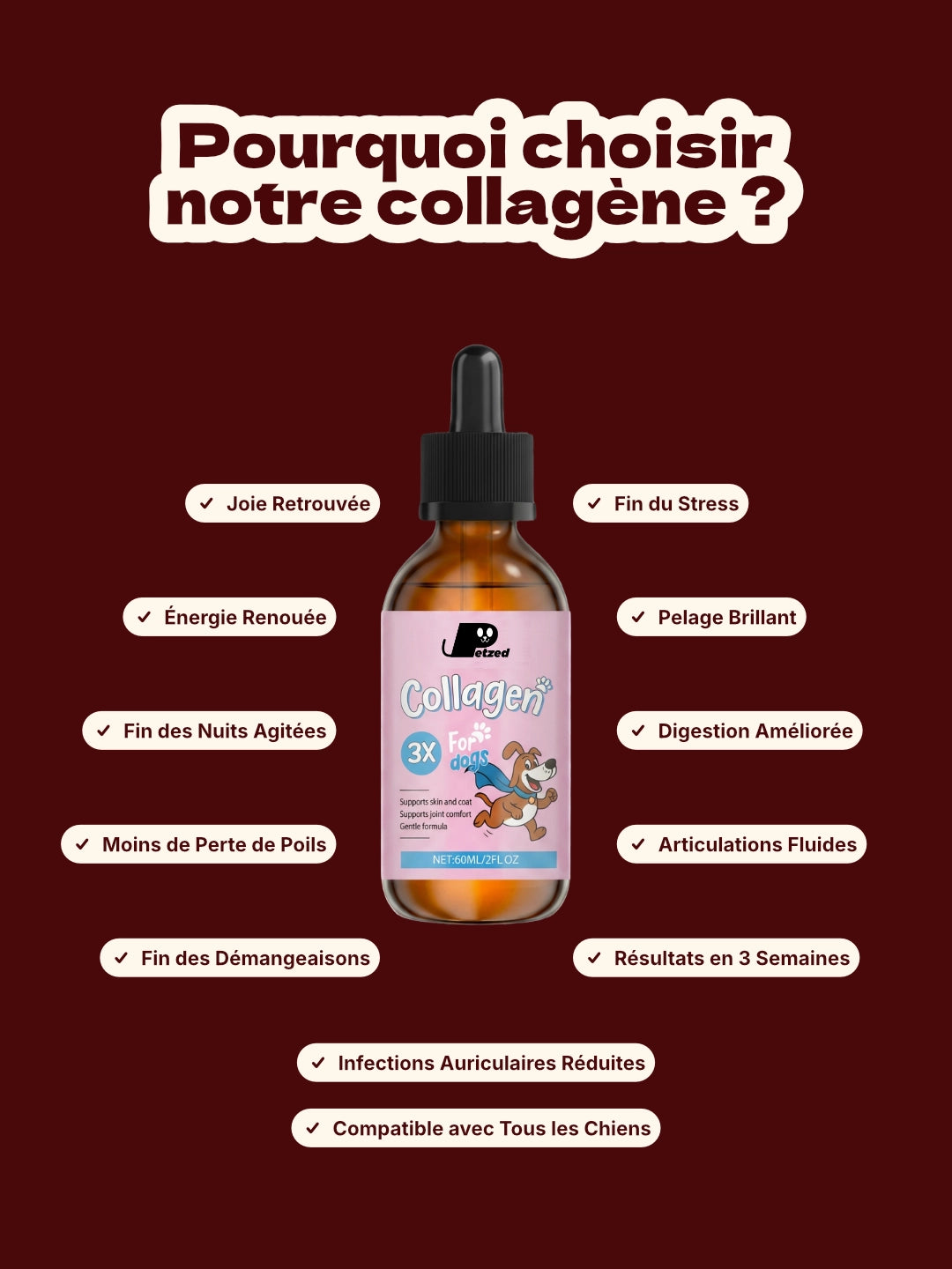 Comme votre chien perd du collagène chaque année, une utilisation quotidienne aide à garder une barrière solide et à bloquer les allergènes.